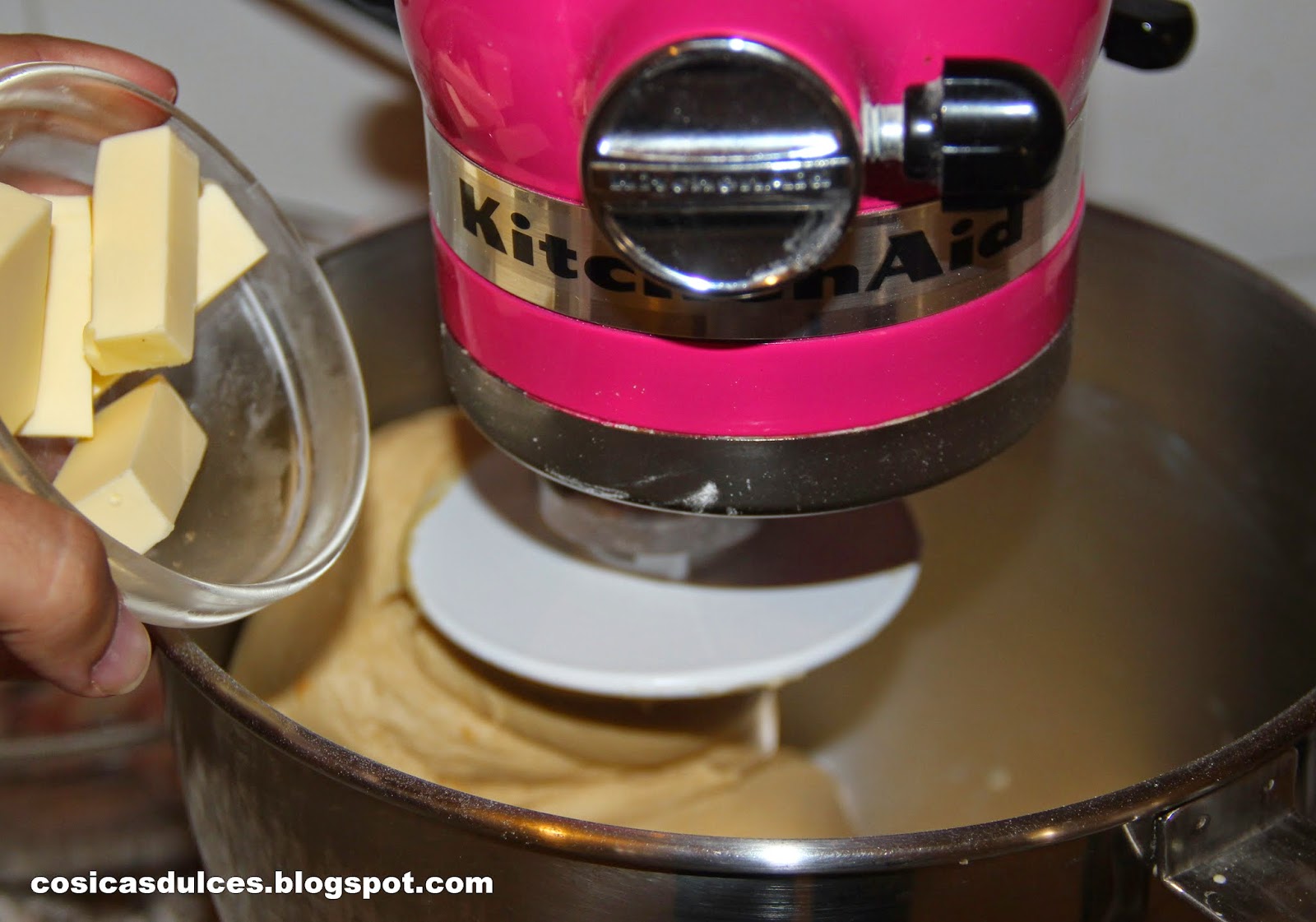 Transcurridos esos diez minutos la masa presentará un aspecto brillante y pegajoso. Es el momento de añadirle la mantequilla a dados y seguir amasando un par de minutos más hasta que esté bien integrada.