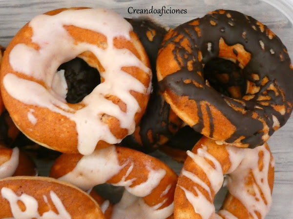 Preparamos la cobertura, en un bol pequeño ponemos el chocolate troceado, la cucharada de fresa y el aceite, calentamos unos 40 segundos en el microondas o unos segundos más si hiciera falta, removemos y echamos por encima de los donuts. La cobertura de chocolate negro la haremos igual pero sin la cucharada de fresa.
