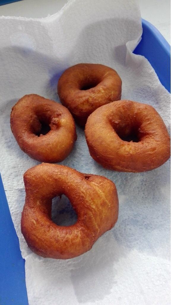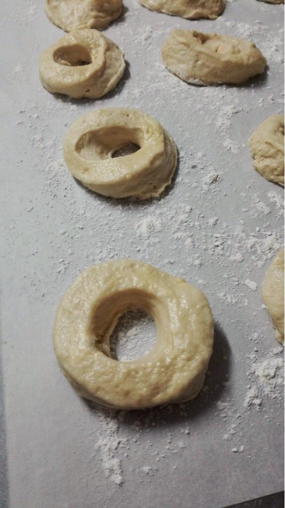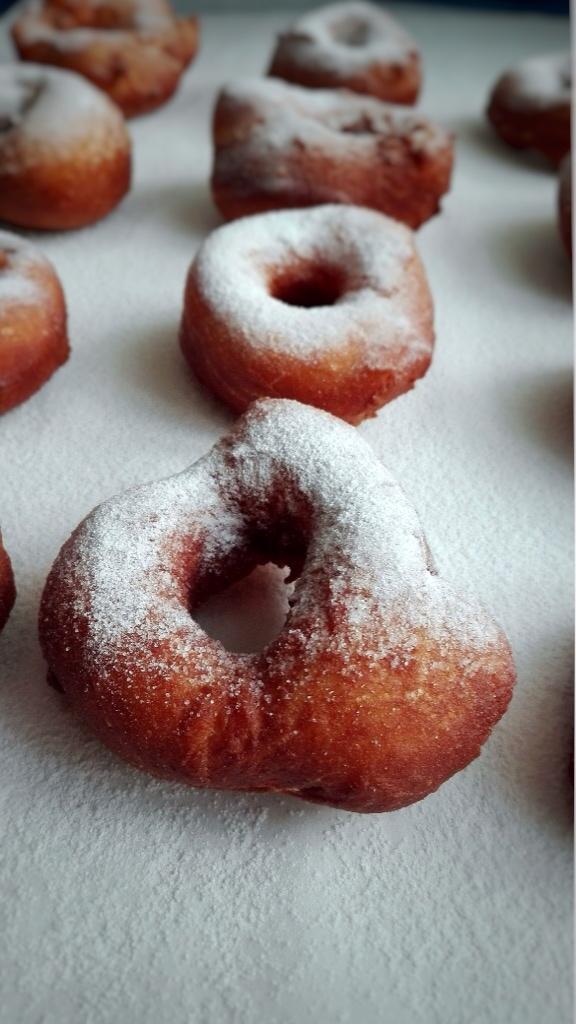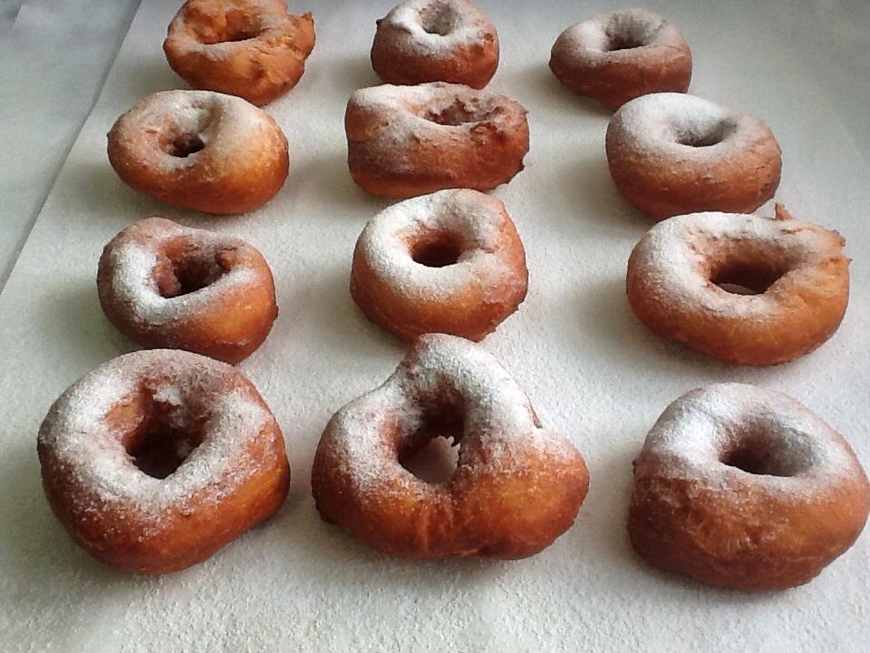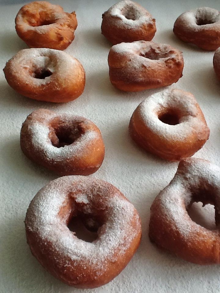 Ponemos a calentar aceite en una sartén honda a fuego medio, echaremos en ella los donuts en pequeñas tandas y los iremos volteando hasta que doren bien por ambos lados.