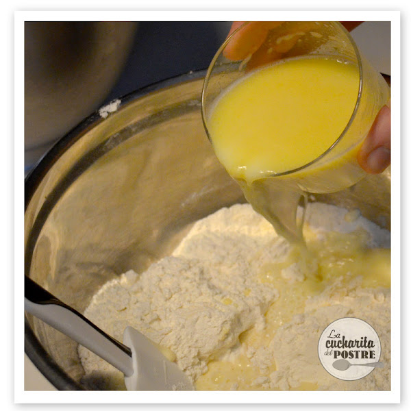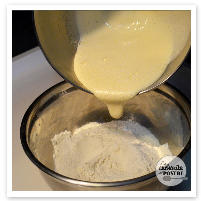 5. Ve agregando la mezcla de huevos poco a poco a la harina.