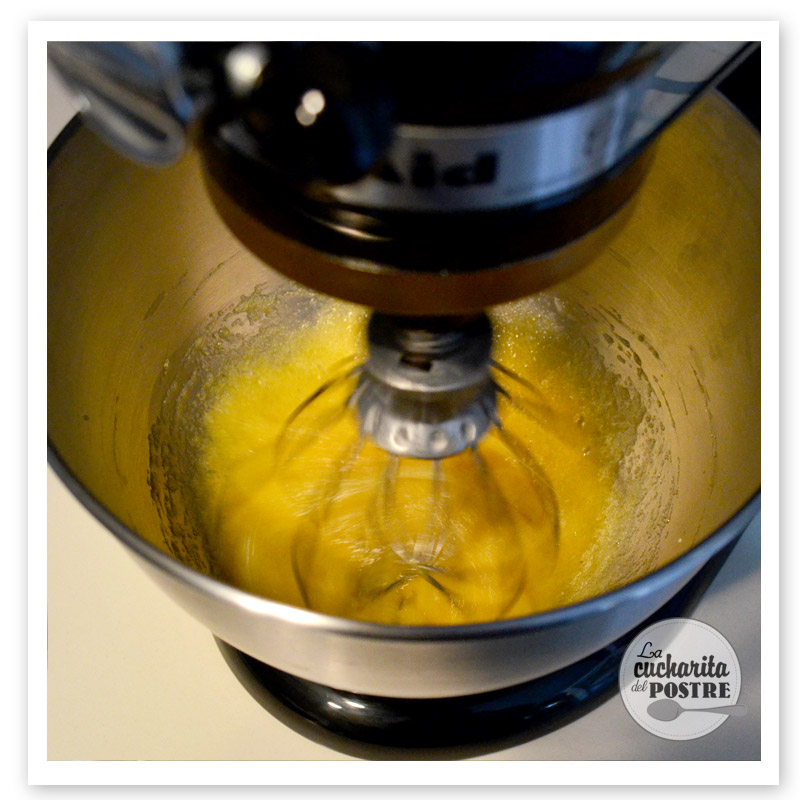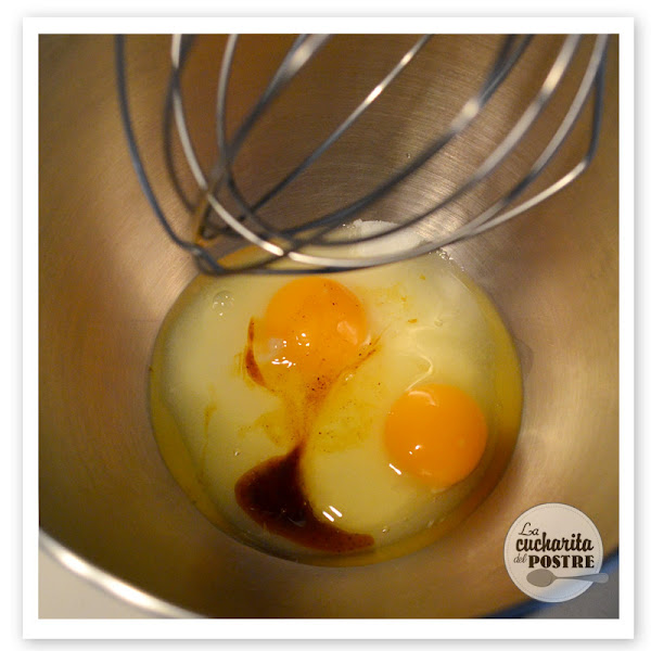 1. En primer lugar, pon el azúcar blanco, los huevos y la vainilla en pasta en el bol de la batidora.