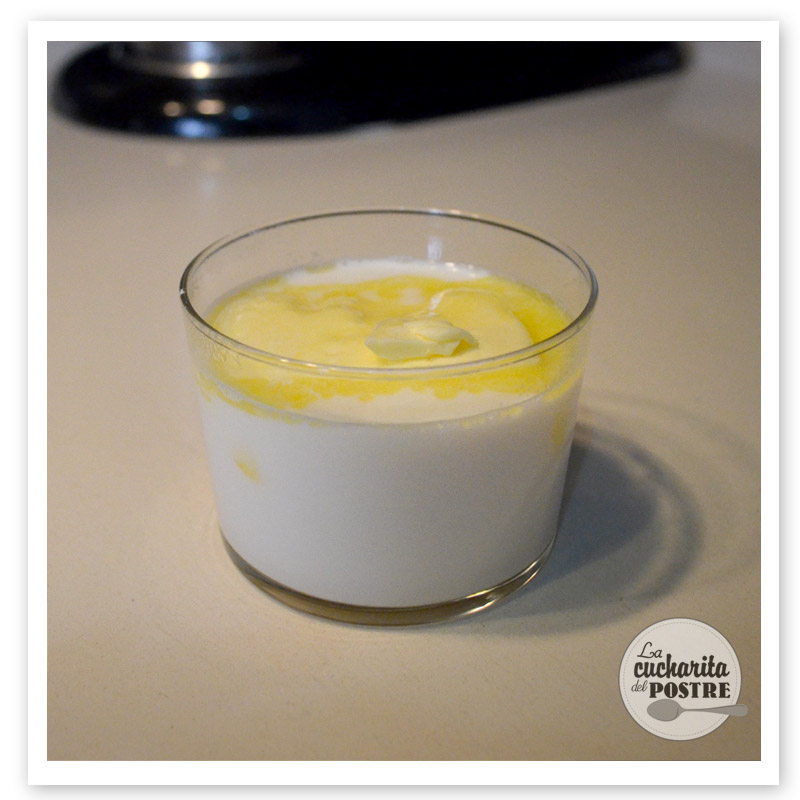 6. Calienta la leche en el microondas y añade la mantequilla. Remueve con una cuchara hasta que se derrita.