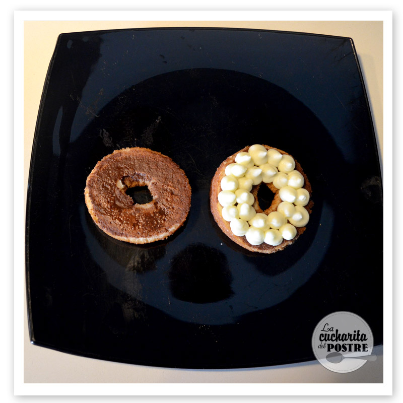 5. Empapa los donuts con la mezcla de café y cacao. Usando una boquilla pequeña y una manga pastelera, rellena una de las mitades con la crema de mascarpone.