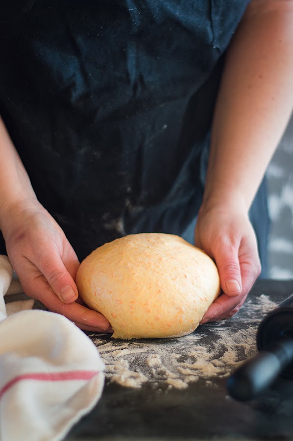 Para la segunda masa deshacemos la levadura en el agua tibia. La ponemos en el bol de la amasadora con las yemas, el puré de zanahoria, el azúcar, sal, la masa anterior, mantequilla y harina. Amasamos hasta que esté bien ligada. La masa es un pelín pegajosa, no pasarse con la harina para que queden más esponjosos.