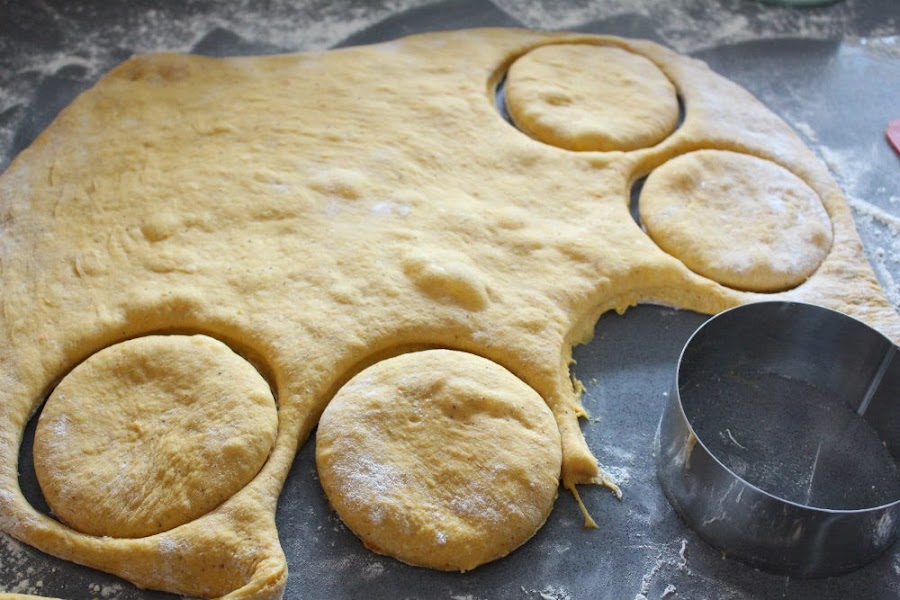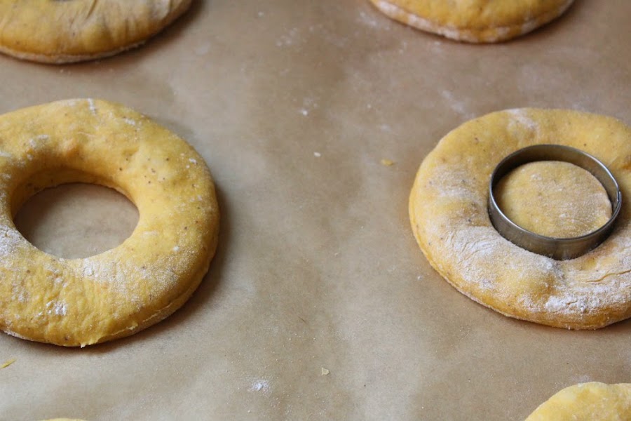 Colocamos la masa sobre una superficie enharinada y, con ayuda de un rodillo la estiramos dejándola de aproximadamente con 1 cm. de grosor. Cortamos los donuts con dos aros de emplatar, o cortapastas redondos de distintos tamaños y vamos colocándolos sobre la bandeja de horno, previamente forrada con papel sulfurizado.