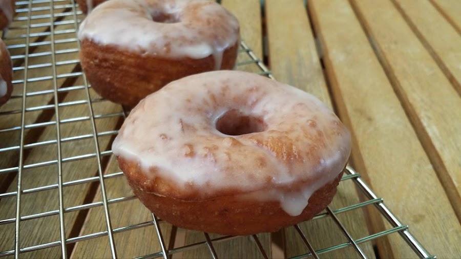 Preparamos el glaseado, tamizamos el azúcar glas para que no queden grumos, y le añadimos el agua, movemos con unas varillas hasta que quede textura de yogur, bañamos los donuts y los colocamos sobre la rejilla hasta que se seque el glaseado.
