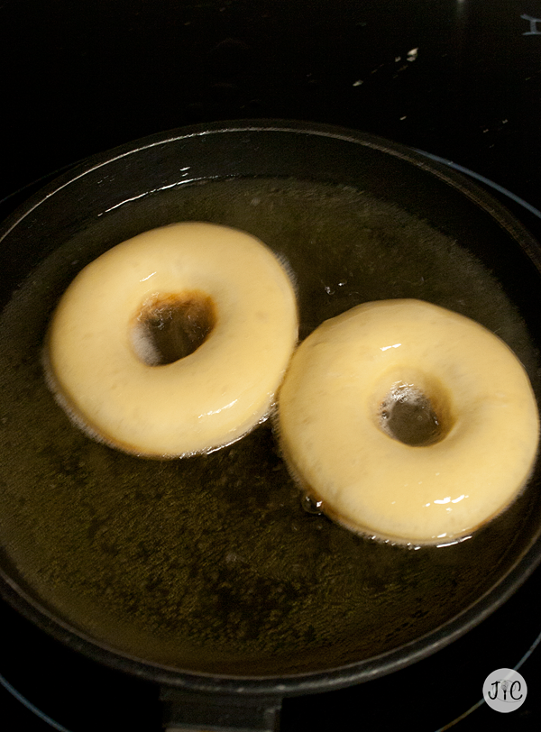 - Vamos introduciendo los donuts de dos en dos y los vamos friendo. Primero un lado y después otro. Más o menos hay que freírlos uno o dos minutos por cada lado, hasta que estén dorados.