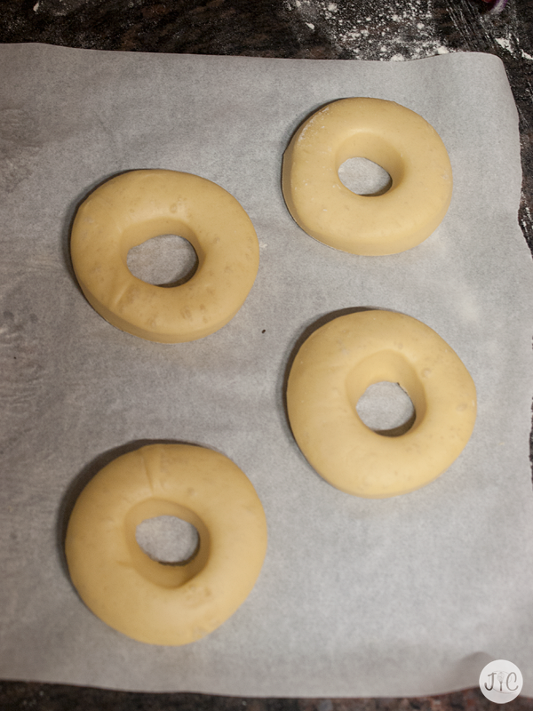 - Cortamos con el cortador de donuts o con dos cortadores circulares de diferentes tamaños. Los centros podemos guardarlos y freírlos a parte (¡atentos que dentro de unos días habrá receta de bolas de donuts!) o reamasarlos.