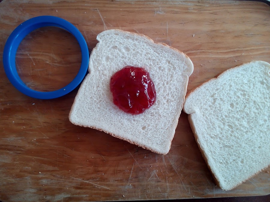 Colocamos una cucharada de mermelada en el centro del pan sandwich, yo preparé algunas de fresa y otras de piña, luego le colocamos la otra rebanada encima y presionamos con un cortador de galletas o con un vaso grande para unir los extremos el pan y darle forma circular.