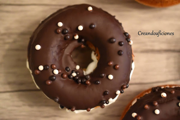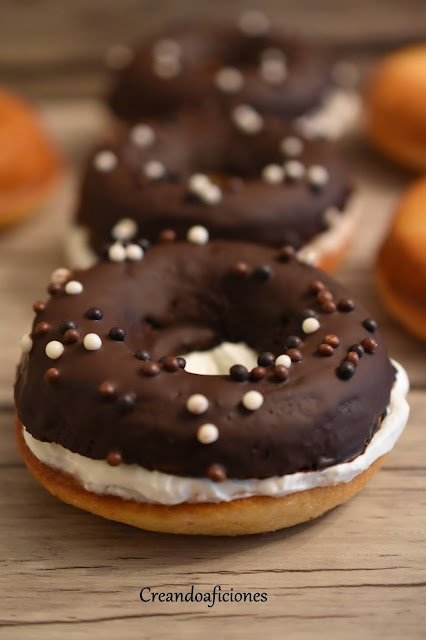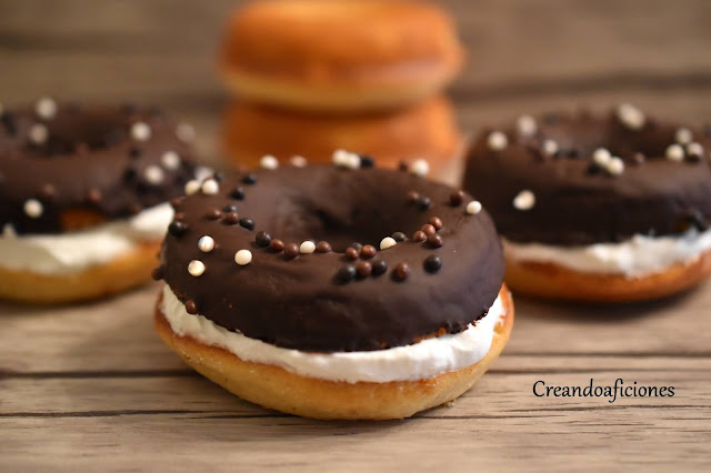 Hoy preparamos estos ricos donuts rellenos de nata (crema de leche) y cobertura de chocolate. Con los ingredientes de esta receta salen 6 donuts. Empezamos.