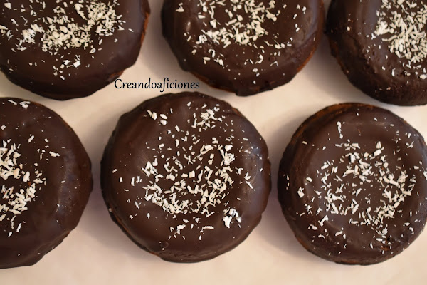 Encima de papel vegetal ponemos una o dos cucharadas del chocolate derretido y encima el donut, hacemos lo mismo con los demás.