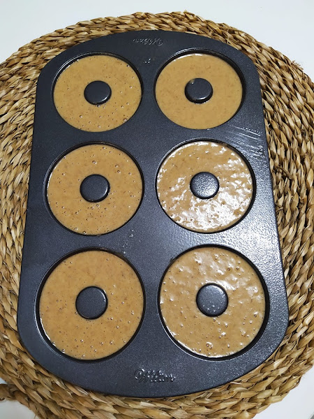 Rellenamos la bandeja de donuts con la masa, dejamos un poco de espacio en cada hueco para que cuando suba no se cierre el agujero del donut.
