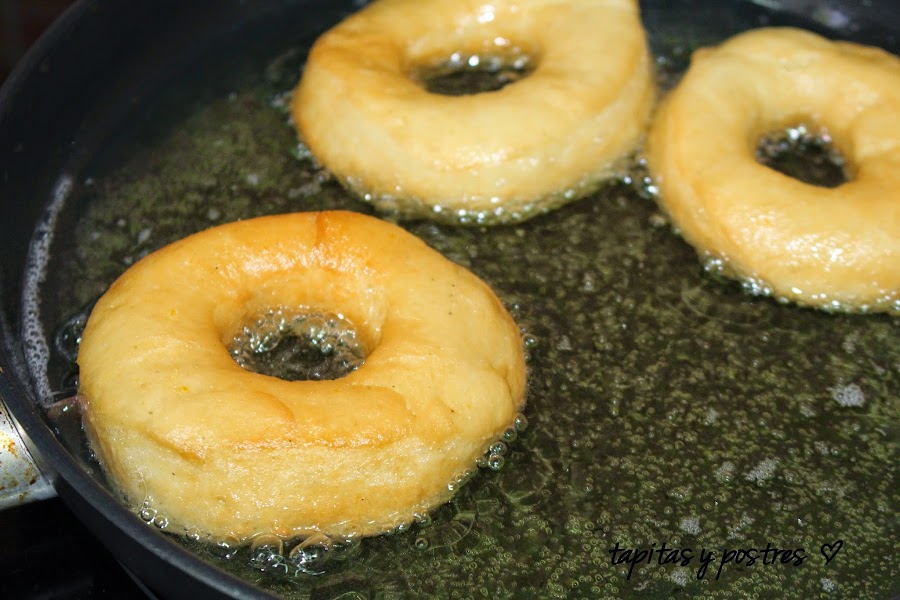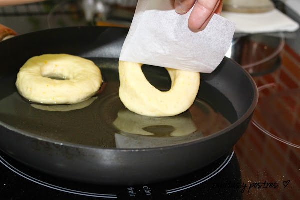 Ponemos abundante aceite de girasol a calentar, no muy fuerte, y cogiendo los donuts con el papel los echamos a freír.