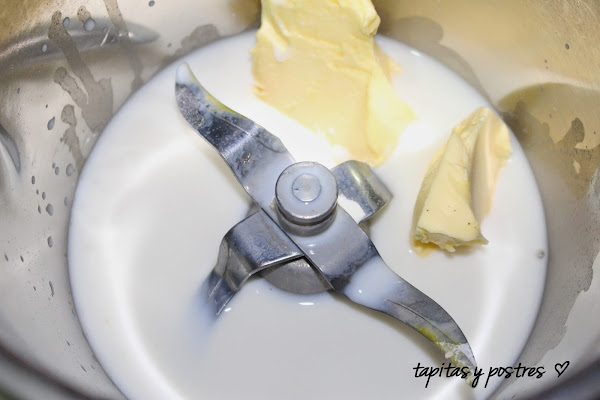 Sin lavar el vaso echar la leche, la mantequilla y el azúcar invertido y templar 3 min, 37ºC, velocidad 1.
