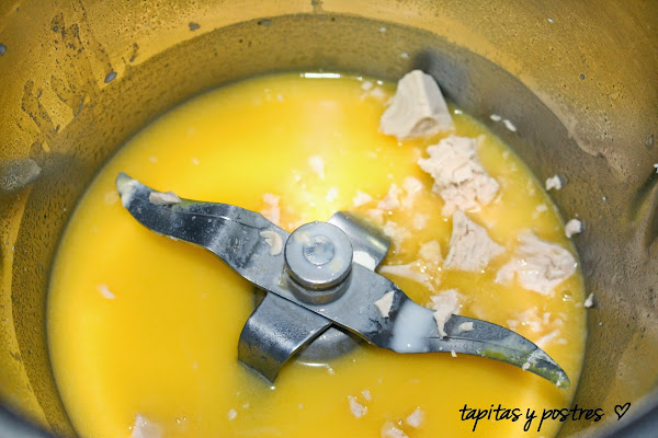Ponemos las dos clase de harina, el azúcar, la sal, el cardamomo molido y la cáscara de naranja y lo trituramos todo. Lo dejamos reservado.