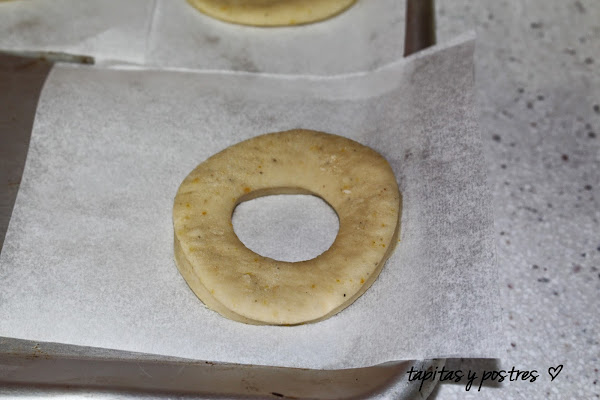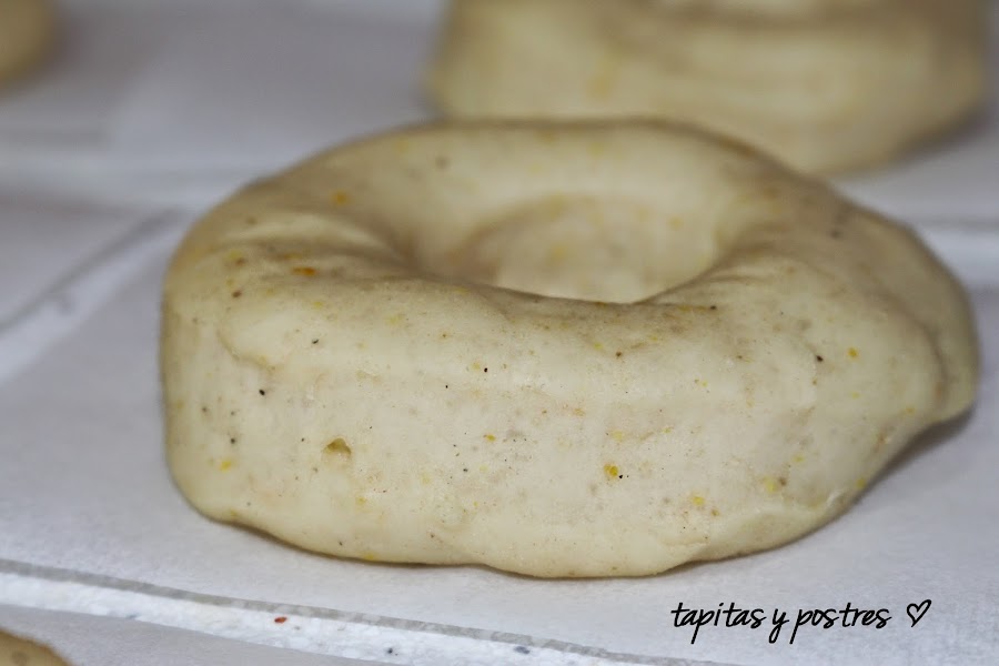 Vamos poniendo los donuts sobre trozos de papel de horno. Un trozo para cada donuts, luego nos servirá para transportarlos hasta la sartén sin manupularlos mucho.