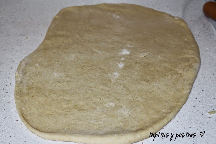 Sacamos y estiramos con el rodillo, dejamos de un grosor de medio cm, aproximadamente.