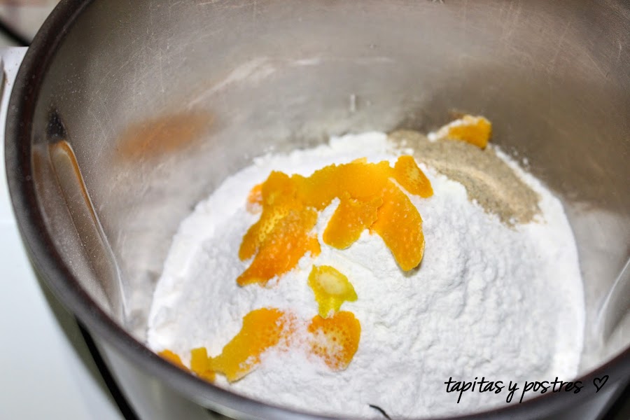 Ponemos en el vaso de la thermomix, las dos harinas, el azúcar, la sal, la piel de naranja y la cucharadita de cardamomo. Trituramos 20 segundos a velocidad 10. Reservamos.