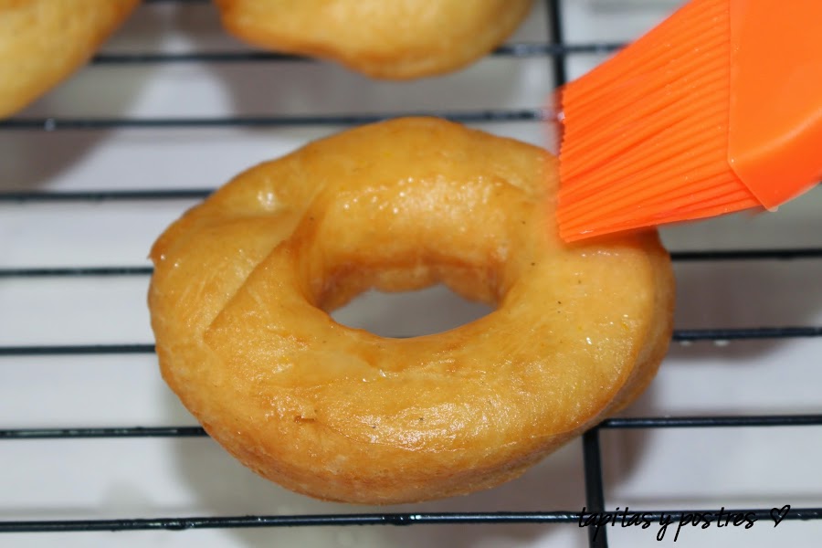 Cuando los donuts hayan crecido ponemos abundante aceite de girasol a calentar. A fuego medio y vamos echando los donuts con el papel, sin tocarlos mucho. Estamos muy atentos porque se doran rápido. Sacamos y ponemos sobre una rejilla y pintamos en caliente, con la glasa.