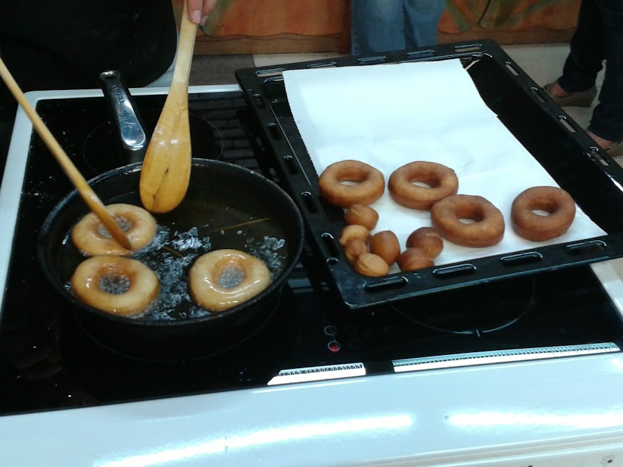 Heat abundant oil in a deep heavy frying pan to 190ºC. Fry donuts a few at a time. Cook on each side until golden brown, aprox. 1 minute. Then remove to drain on paper towels. Let them cool.