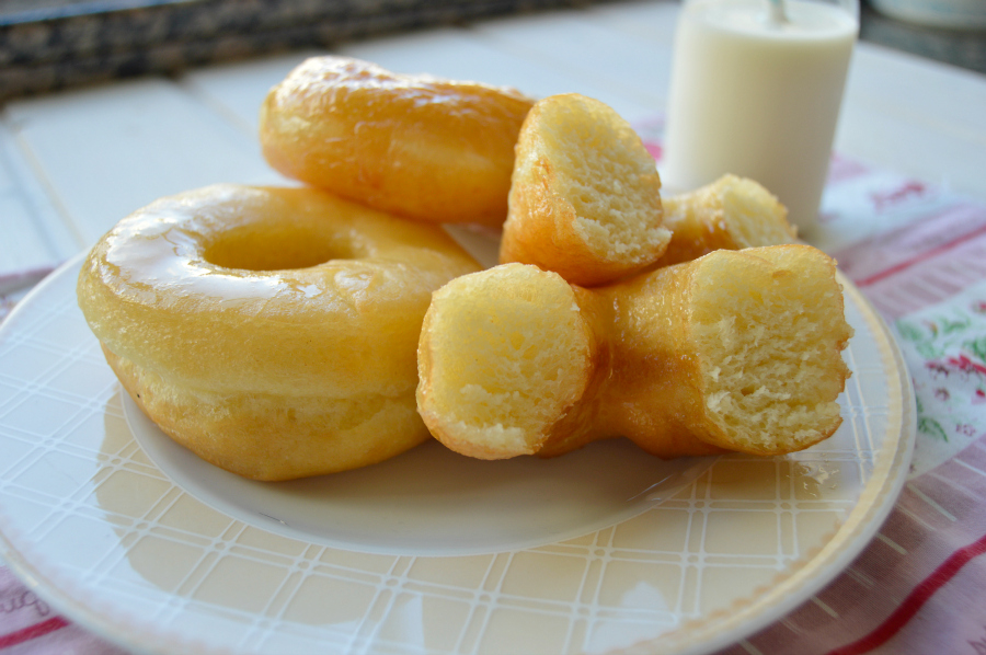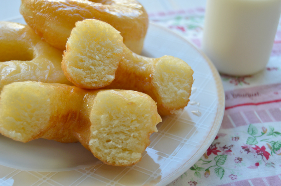 5. Freímos los donuts cuidadosamente, sólo hasta que estén ligeramente dorados en el aceite de girasol no demasiado caliente, para que no se tuesten demasiado rápido. No deben tocar el fondo, por eso yo los frío en un cazo en vez de en una sartén. Retiramos del aceite y dejamos sobre un papel absorbente para que escurran el exceso de aceite.
