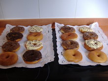 Cuando pasen las dos horas se van cogiendo porciones de masa, se estira sobre una superficie plana previamente espolvoreada con harina y se hacen los donuts: se estira la masa no muy gorda (porque crece mucho en la sarten) y se hacen los donuts con la ayuda de la boca de un baso y el agujero con el quita_corazones de las manzanas y se friten en mucho aceite de oliva (mas bien frio que caliente ysolo hasta que esten un poco dorados)y se ponen en un recipiente.