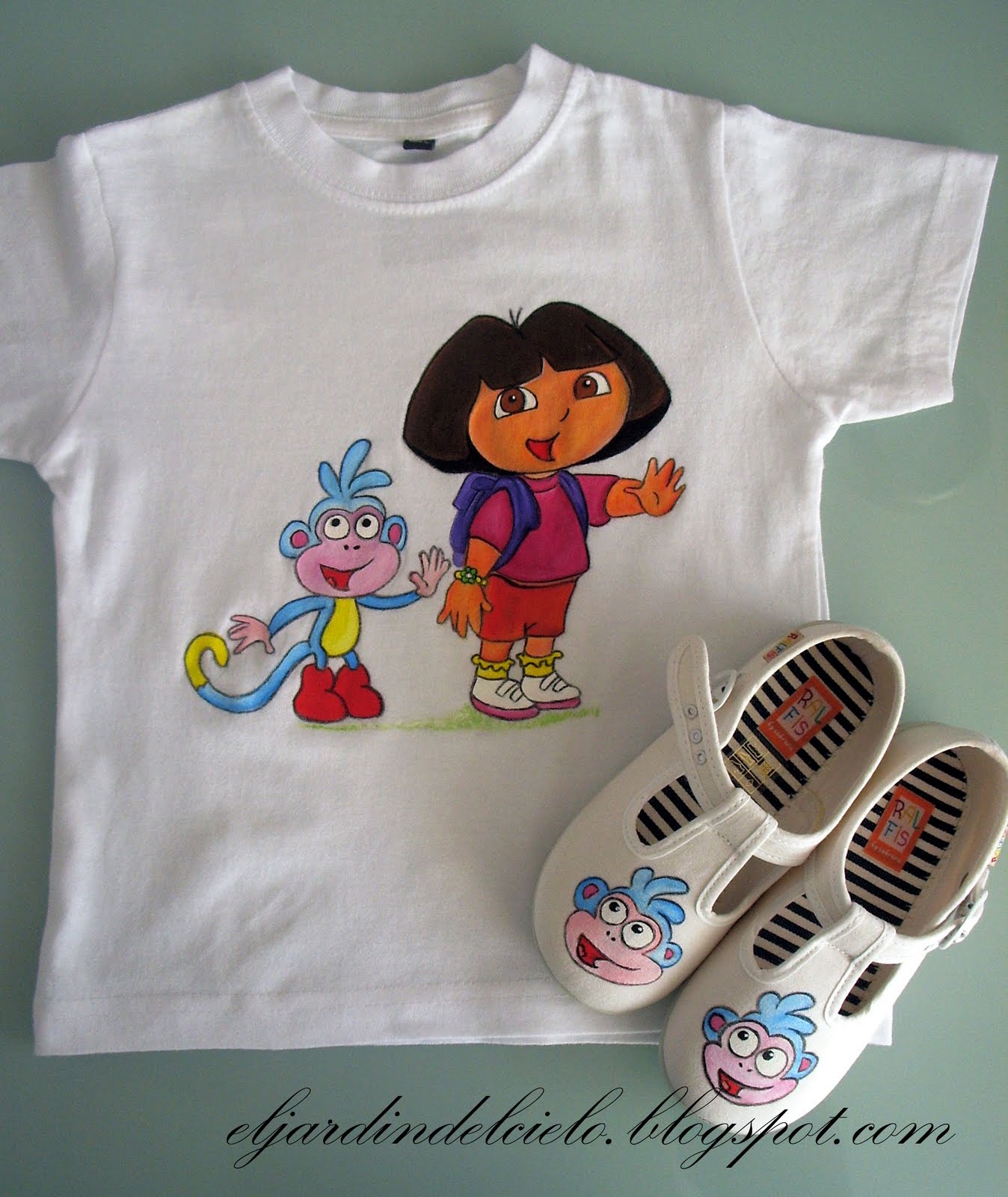 Para el cumpleaños de mi sobrina le he pintado esta camiseta de Dora la exploradora y unos zapatos de botas, que le gusta mucho. Felicidades Rocío.