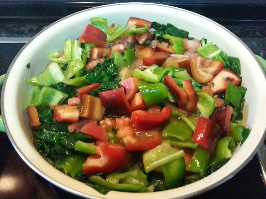 Cuando reduzcan de volumen, añadimos los pimientos cortados en trozos y los tomates cortados finos. Salamos y rehogamos durante unos diez minutos.