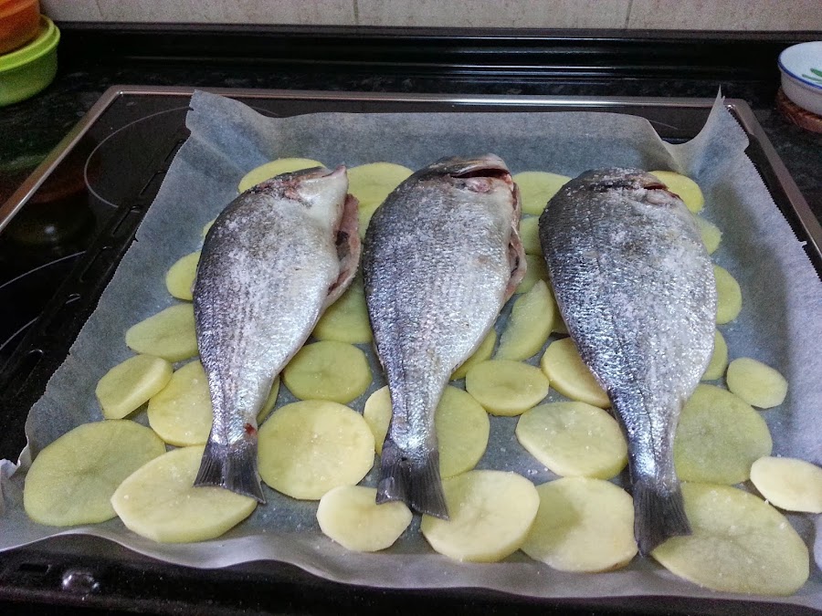 Salamos las patatas y les echamos pimentón ahumado. Salamos las doradas y las colocamos sobre las patatas.
