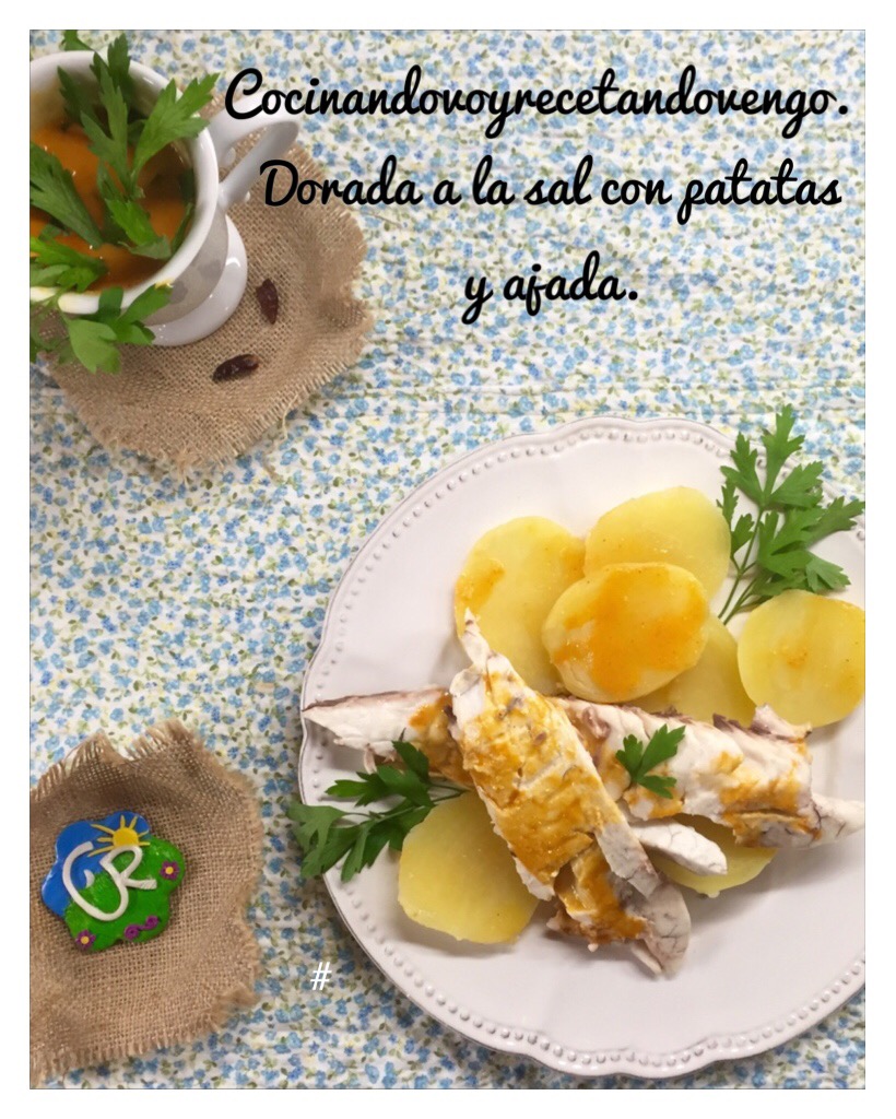 Una vez finalizado el tiempo, sacar el recipiente del horno, con un cuchillo o pala de cocina, hacer una abertura a la capa de sal, destapar las doradas, la sal saldrá facilmente como una costra, si son doradas de tamaño ración y para adultos se puede servir la dorada entera en el plato, pero a mi no me importa limpiarlas y presentarlas con las patatas listas para comer y disfrutar en la mesa.