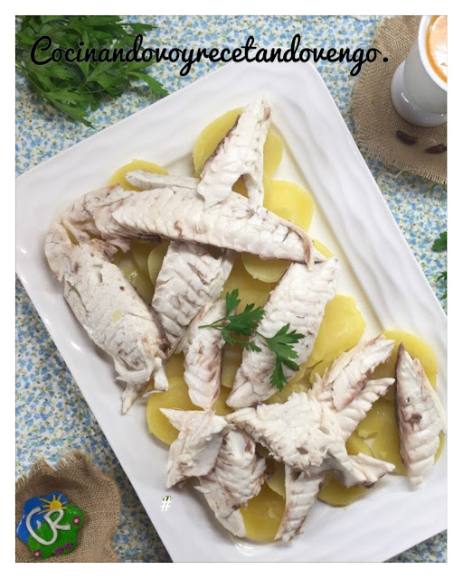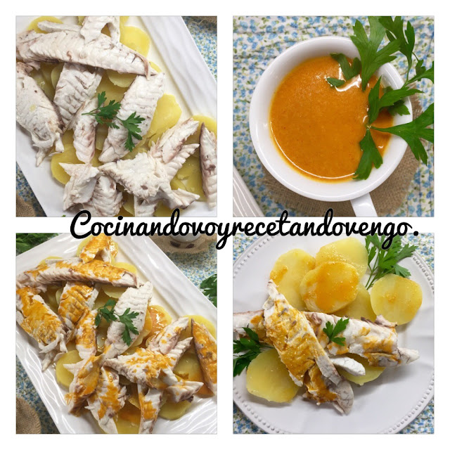 Pelar las patatas una vez cocidas y escurridas (guardar un vaso del agua de la cocción si vais a preparar la salsa), cortar las patatas en láminas. Yo las coloco en una bandeja y las como de base. Luego coloco los lomos limpios de dorada encima de las patatas y ya tendremos listo el plato. Puede acompañarse con un poco de mahonesa, pero como a nosotros más nos gusta es con una ajada o salsa "a la gallega" que es como la llamamos nosotros.