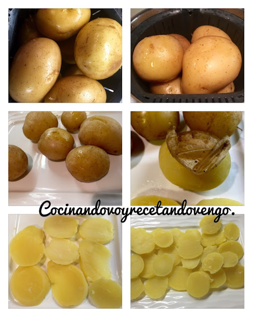 En una olla con agua y sal, ponemos a cocer unos 30-40 minutos (según tamaño) las patatas enteras, con piel, bien lavadas.