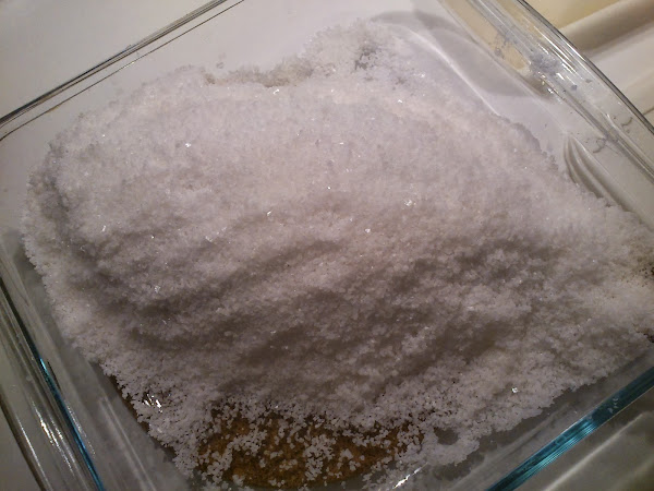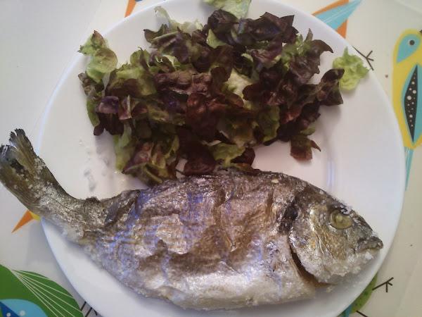 Ponemos el horno a precalentar a 200º. En una fuente apta para el horno ponemos una capa de sal (sólo la zona donde va a estar el pescado) ponemos la dorada encima y tapamos con más sal con cuidado de tapar tb los laterales. Sino tenemos fuente lo suficientemente grande, podemos ponerlo directamente sobre la bandeja de horno encima de papel de albal. La dorada debe quedar totalmente tapada de sal, sin verse. Aplastamos un poco y echamos unas gotitas de agua por encima de la dorada.