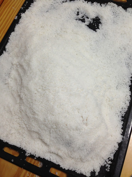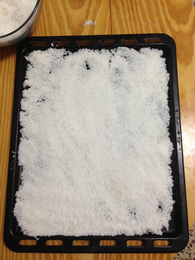 Cogemos una bandeja para el horno y le hacemos una cama de sal gruesa para evitar que la piel de la dorada toque directamente la placa.