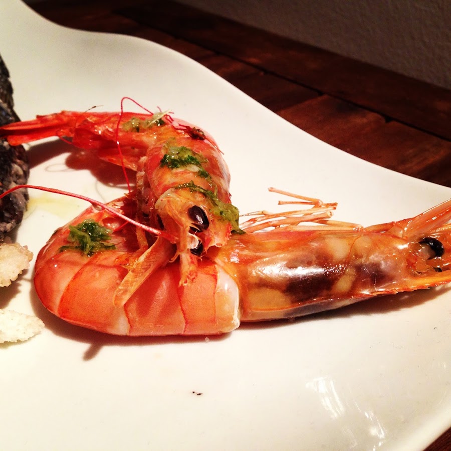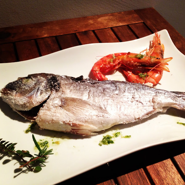 Ahora será hora de servir. Con una espátula, con cuidado, pasamos la dorada directamente de la placa al plato. Podemos acompañar con lo que nos parezca más adecuado. En este caso el acompañamiento han sido dos gambas hechas a la plancha con un picadillo de ajo, perejil, sal, limón y aceite.