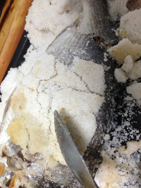 Pasados esos 30 - 35 minutos sacamos la bandeja y con ayuda de una cuchara y un tenedor vamos retirando la sal de encima de la dorada. Lo hacemos con cuidado para evitar estropear la piel y la carne de la dorada.