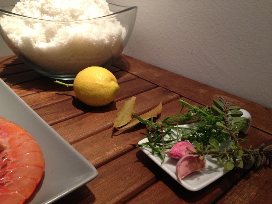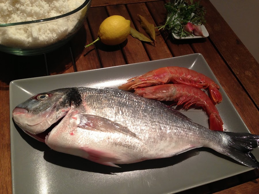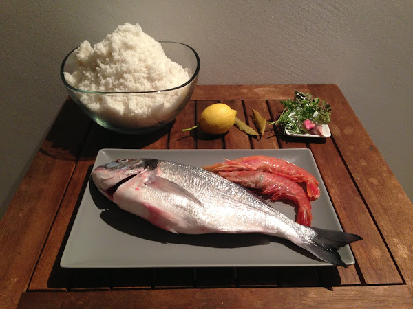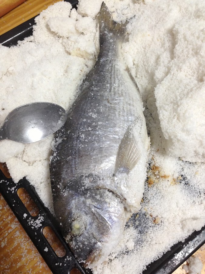 Seguidamente pondremos la dorada encima de esa sal y la cubriremos por completo con el resto de sal. Lo hacemos hasta que el pescado quede cubierto por completo.