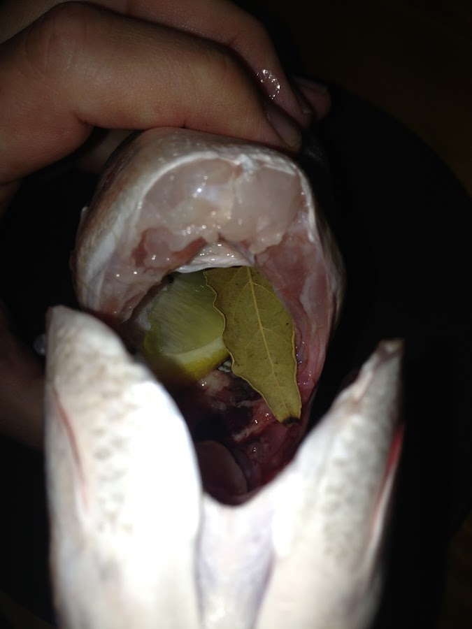 En el hueco de donde hemos quitado las tripas metemos una rodaja de limón, una hoja de laurel, un rama de romero, una rama de mejorana, unas hojas de perejil, dos ajos pelados y un chorro de aceite.