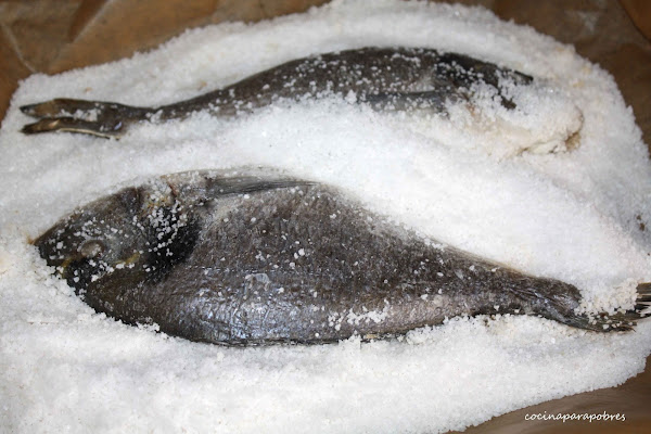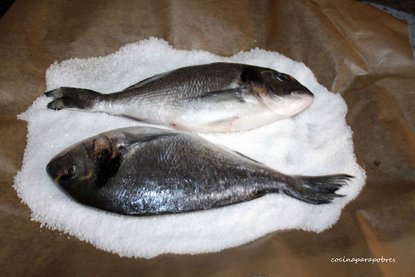 aceite de oliva Sobre la bandeja del horno previamente forrada con papel de hornear, colocamos una capa aproximadamente de 2 cm de grosor, colocamos encimas las doradas y las cubrimos con sal.
