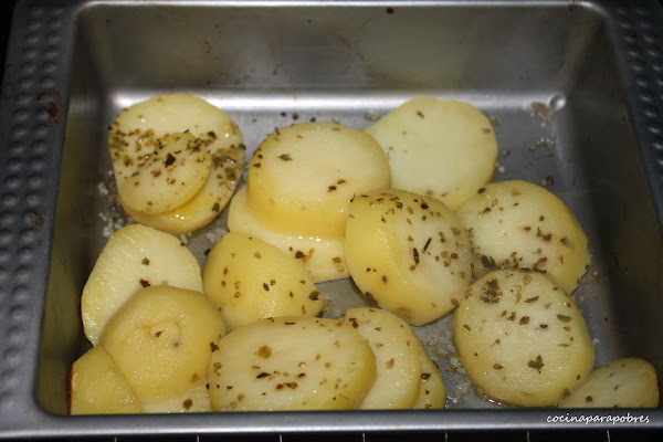 En un molde ponemos un poco de aceite de oliva y coloramos las patatas peladas y cortadas en rodajas, intentado que queden todas del mismo grosor para que se hagan por igual. Agregamos sal, oréganos y cubrimos el recipiente con papel de plata.