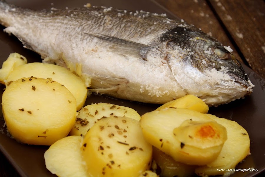 Retiramos con un tenedor la sal que cubre la dorada , con una espátula o paleta las servimos a los platos y las acompañamos de patatas.