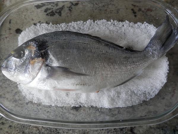 Pondremos encima la dorada preparada para asar, es decir, con escama pero habiendo sacado la tripa por la garganta para que no entre sal dentro.