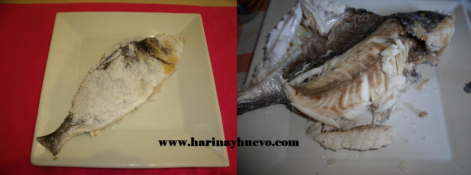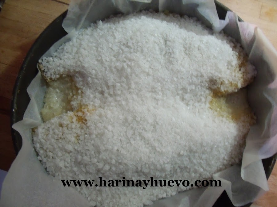 Poner el horno a 200ºC mientras preparamos las doradas. Lavamos las doradas que estarán sin viceras pero con la cabeza. Ponemos una capa de sal en la bandeja del horno, colocamos las dos doradas y las cubrimos con un dedo de sal. Si no tenéis bastante sal se puede poner un papel de horno en vez de la capa inferior de sal (es lo que me pasó a mí)