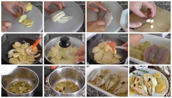Cuando tengamos las patatas las colocamos en la base de una bandeja apta para el horno, sobre estás colocamos los las doradas con la piel hacia abajo y metemos la bandeja en el horno.