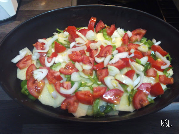 Vierte 1 cucharada de aceite en una fuente refractaria, y coloca las verduras por el siguiente orden: primero las patatas y a continuación la cebolla,los ajos, los pimientos y los tomates. Salpimienta, riega con un hilo de aceite de oliva y con el vino. Introduce en el horno unos 15-20 minutos.