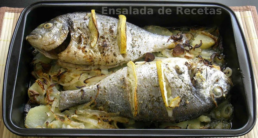 Pelar y cortar un par de ajos y picar una cebolla y sofreírlo en un poco de aceite, cuando casi estén hechos verterlo sobre las doradas y meterlo al horno unos 20 minutos. Suele decirse que el pescado estará listo cuando se le pongan los ojos en blanco, pero yo suelo dejarlo un ratito más, por aquello de que me gusta bien hecho, pero no más de 30 minutos o se os secará.