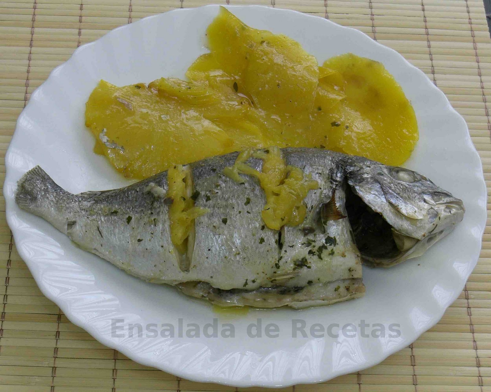 Precalentar el horno a 200º. Limpiar la dorada y adobarla con sal, ajo en polvo, perejil y pimienta blanca. Pelar y cortar la piña y el mango en rodajas finas. Hacer un par de cortes en la dorada y colocar un par de trozos de piña.