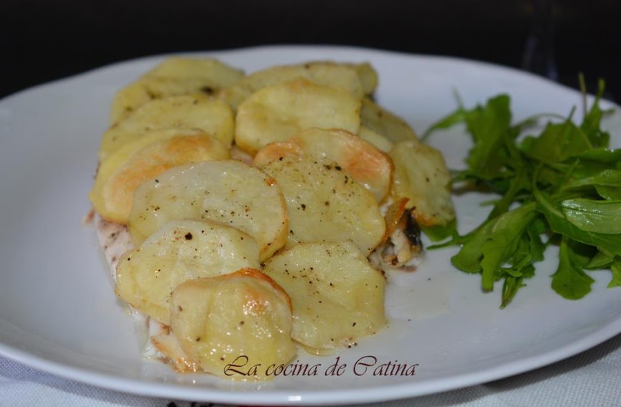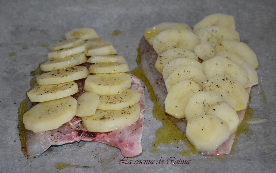 Cubrimos con las rodajas de patata, ligeramente superpuestas entre sí. Salpimentamos, echamos un chorrito de aceite por encima.
