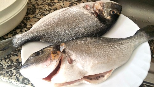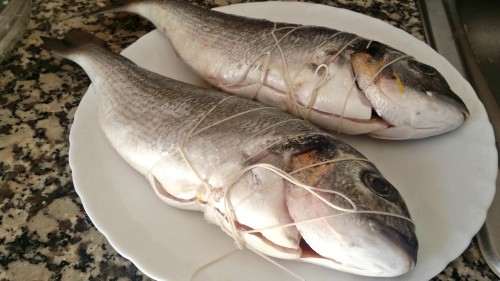Yo compré doradas porque en un principio pensé que las iba a hacer al horno. Cuando leí la receta ¡Oh cielos! ¡Se hacen a la sal! Así que ni corta ni perezosa las rellené como dice la receta y las até con hilo para que no se abrieran.