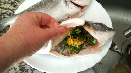 Lava el perejil, agítalo y agrégalo a la cavidad abdominal con jengibre y ralladura de limón. Ya sabéis que para la dorada a la sal no debe abrirse la dorada entera.